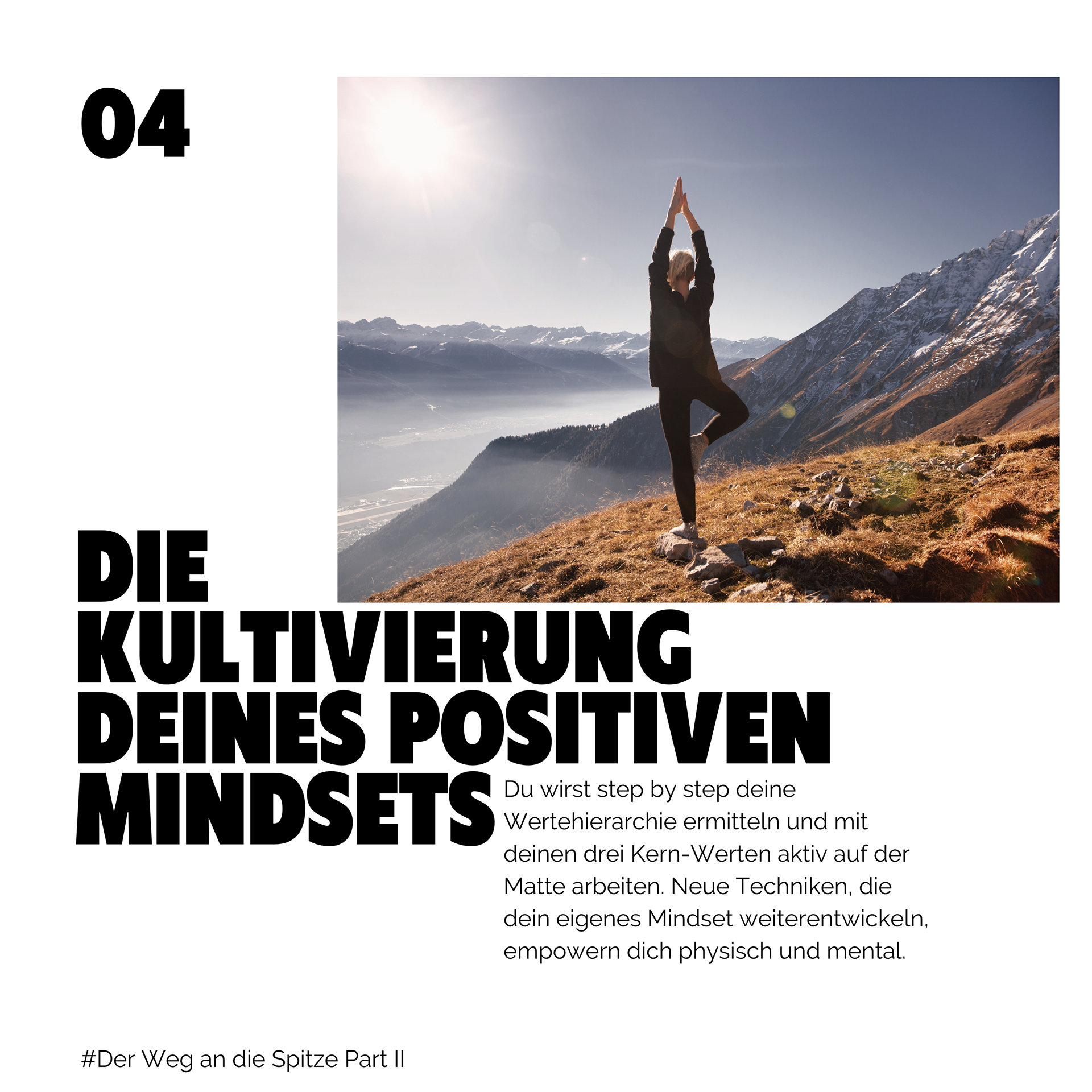 Mein Online-Programm "Mountain Mindset" ist das Herzstück meiner tiefen Vision: Menschen zu befähigen, ihre eigene Persönlichkeitsentwicklung aktiv zu gestalten und dabei tatkräftige Unterstützung zu erhalten. Als wegweisendes Programm kombiniert Mountain Mindset das transformative Mindset-Training mit den heilsamen Praktiken des Yoga, als erstes Programm am Markt. Es bietet eine einzigartige Gelegenheit, die eigenen Grenzen zu überwinden und zu lernen, sein individuelles, tiefgreifendes Potenzial zu entfalten. In Zusammenarbeit mit meinen Kooperationspartnern VIO YOGA und dem Hotel der Goldene Berg in Oberlech, sowie meinen Sponsoren LULULEMON und BLACKROLL ist diese ganzheitliche Reise in Form eines Online-Programms entstanden.